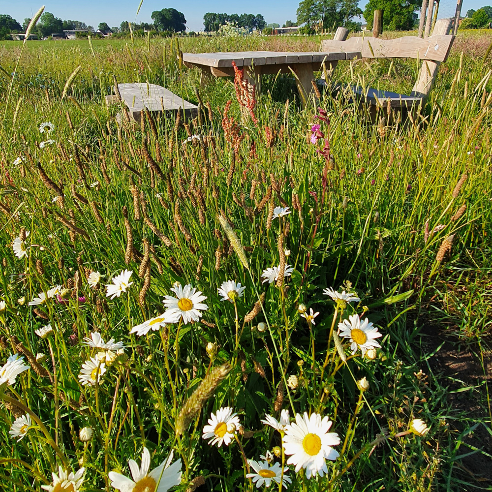 Der Grünstreifen mit Blumenwiesenmischung blüht im Sommer wunderbar bunt.